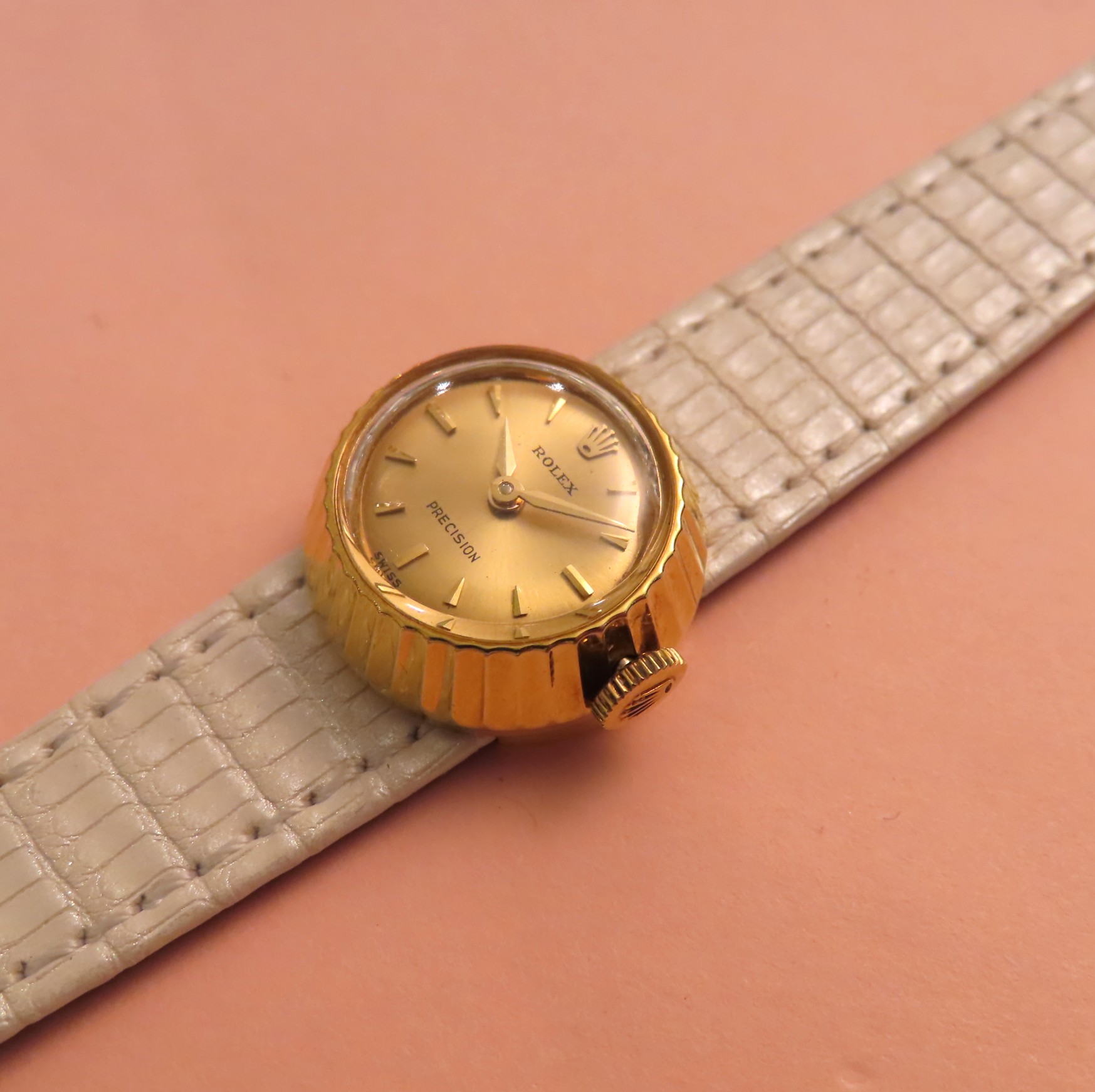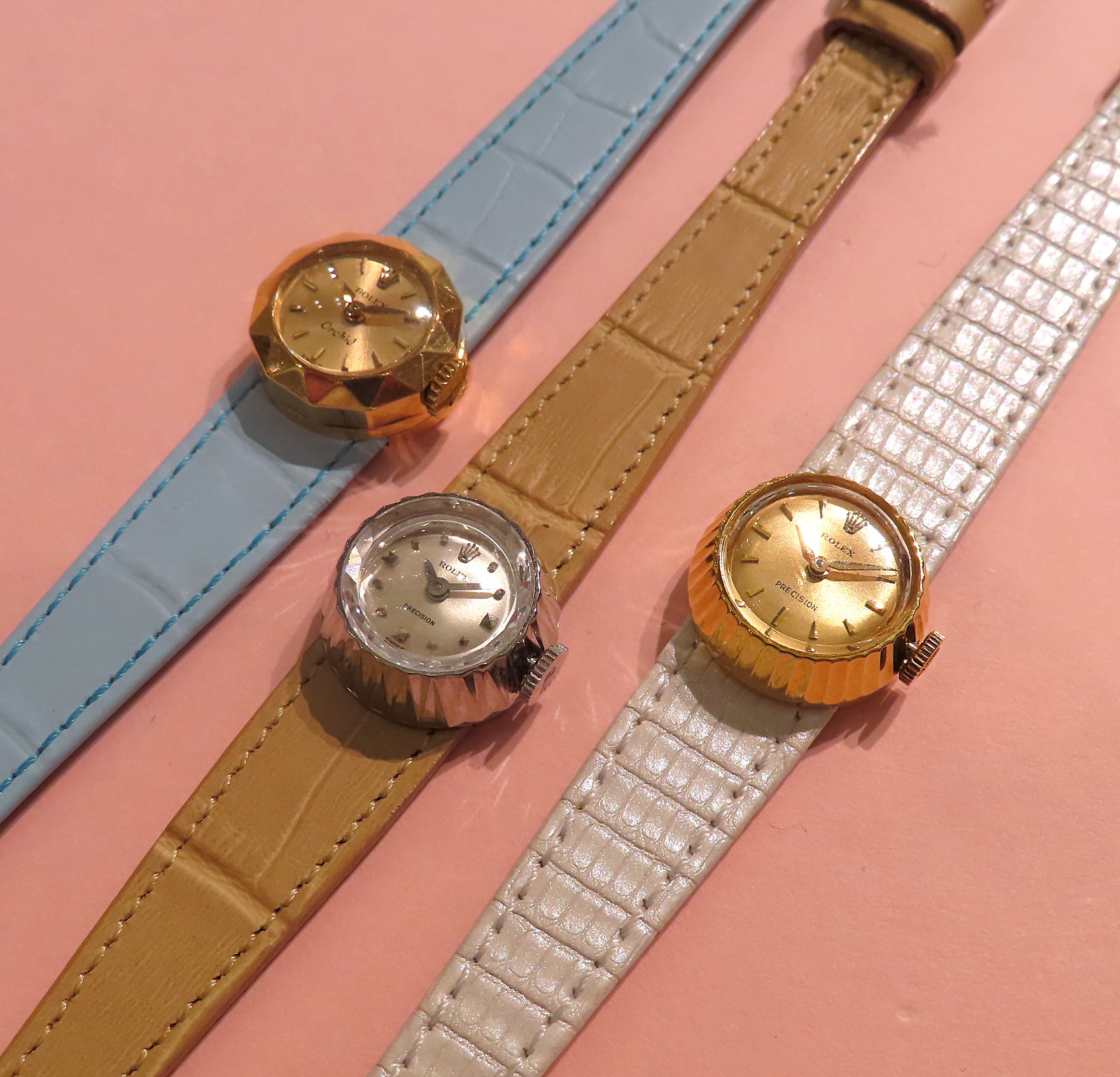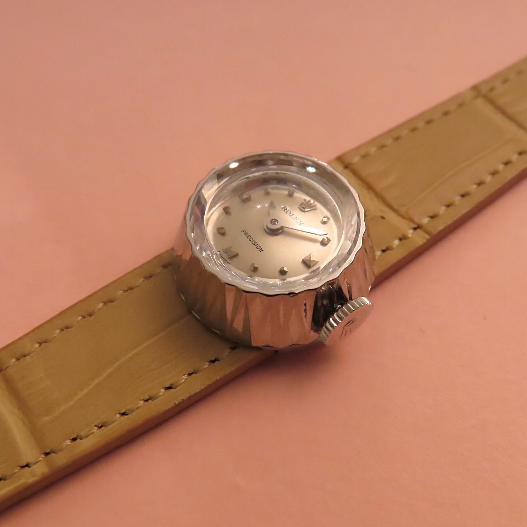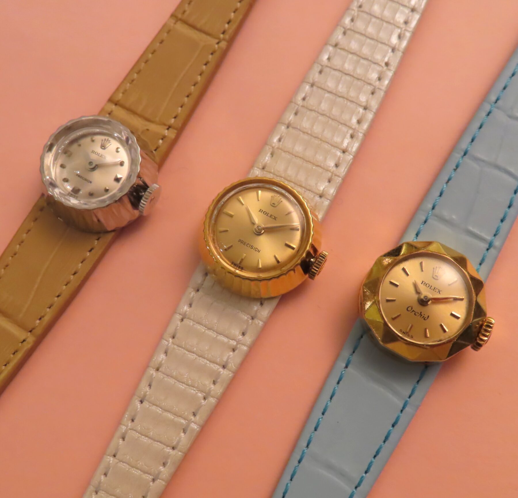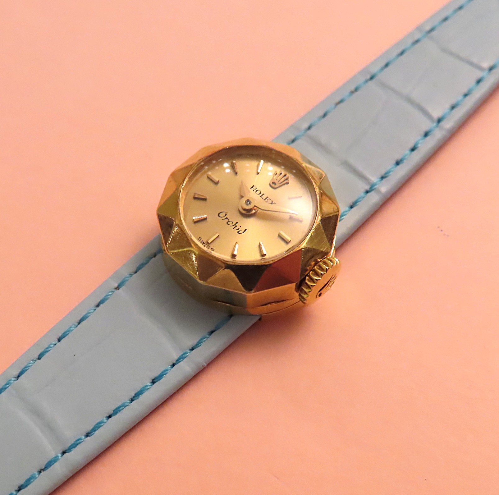 ベゼルに設けられたファセット(切子面)が目を惹きます。受けた光を反射し、宝石の様に輝きます。ダイアルには”欄”を意味する”Orchid”の文字が見て取れます。当時は18金イエローゴールドやホワイトゴールドなどの金無垢(貴金属のみ)で作られたモデルにのみこの名が冠されてたようです。