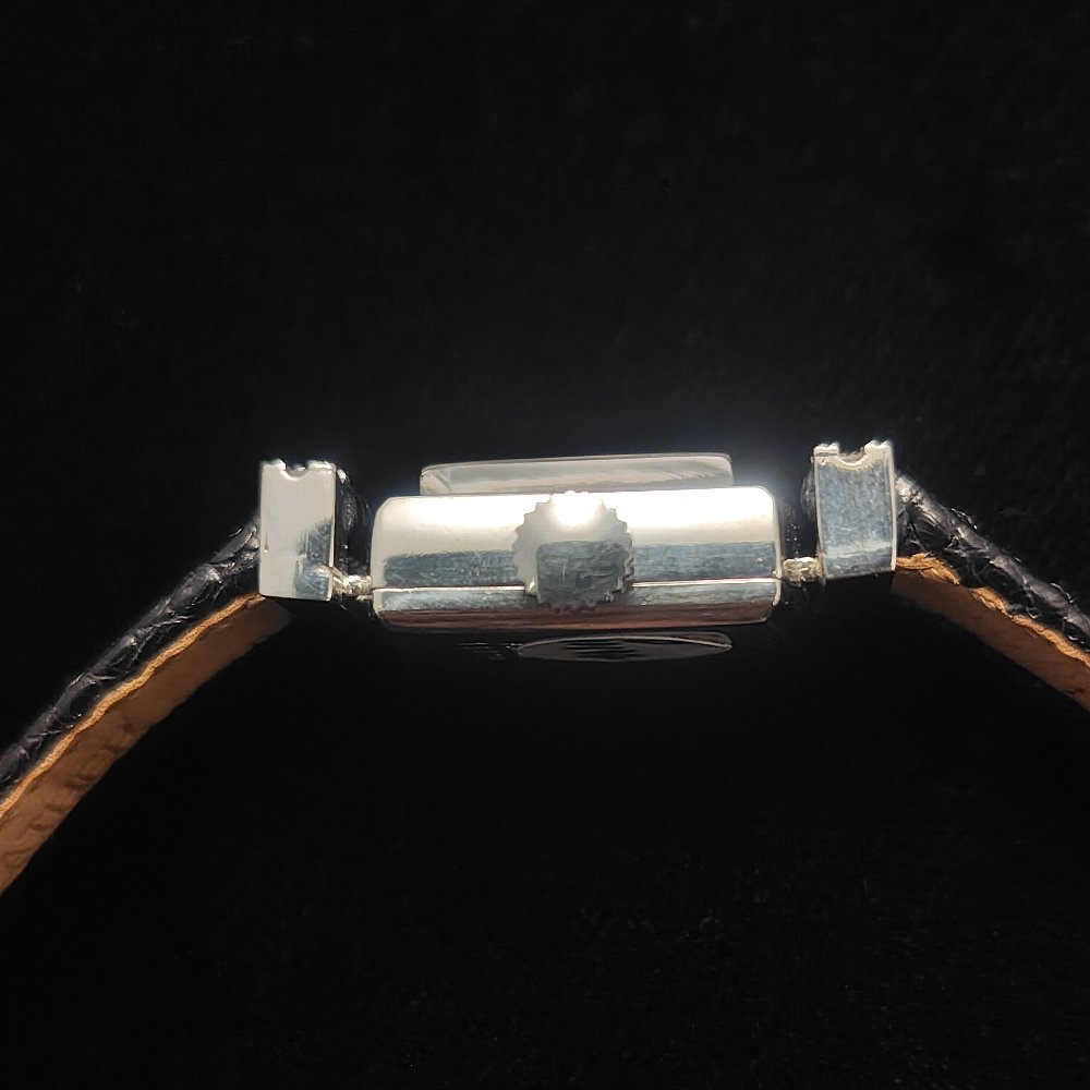 長方形の本体はやや広めのフラットなベゼルでダイヤルを取り囲んでおり、あたかも回廊のようになっています。