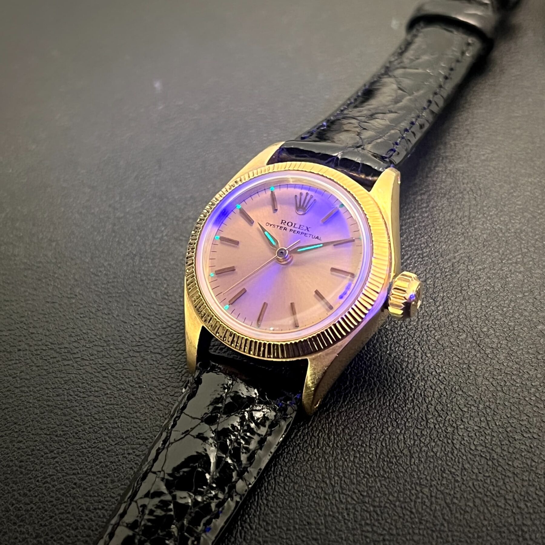 当時はトリチウムという夜光塗料が使われており、半減期がある為もう自発光はしないですがブラックライトを当てると発光します。レディースで夜光が使われている時計が珍しかったので撮影してみました。